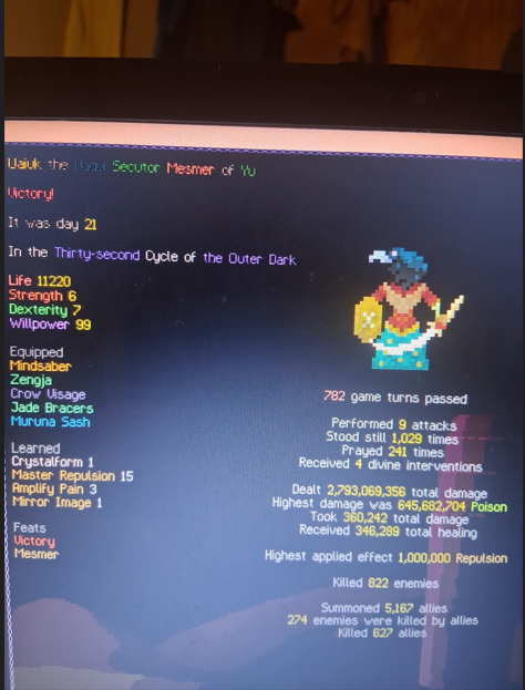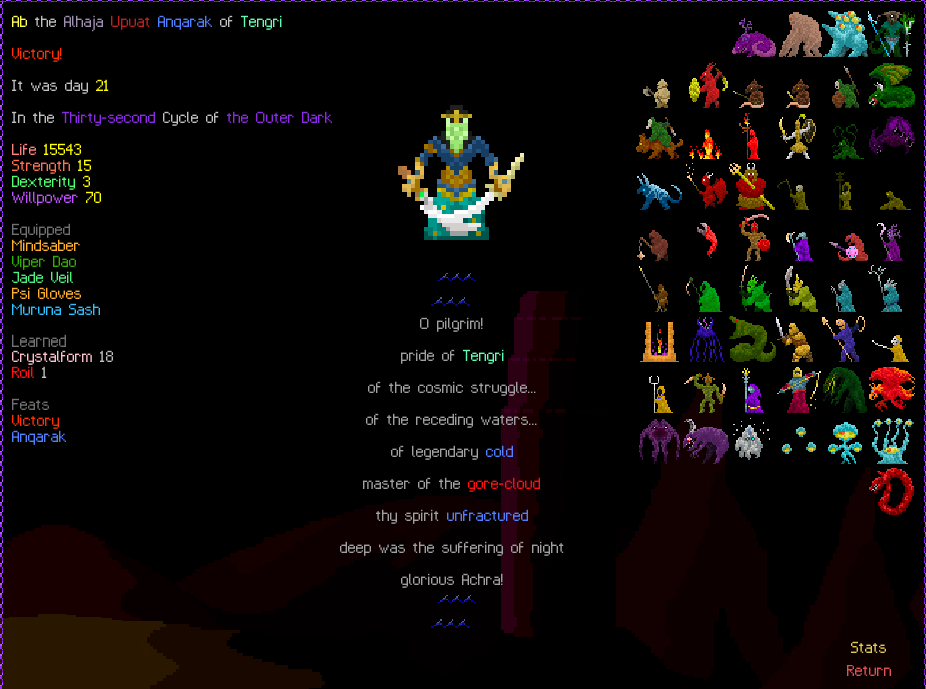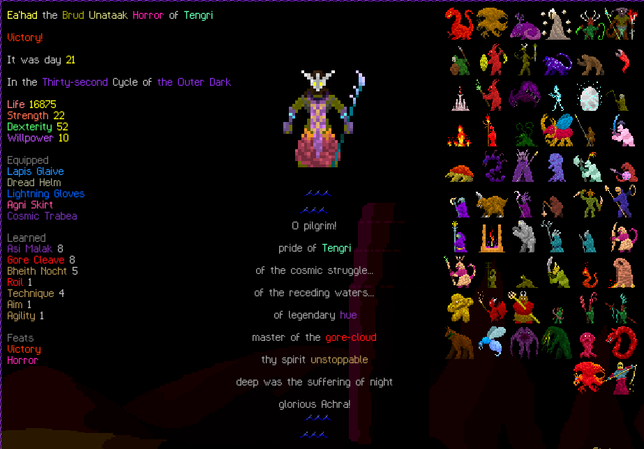 Once you get rolling, you are pretty much invincible. Horror inflicts thousands of stacks of bleed, and Brud heals on attackXbleed/doom/poison. Tengri gives solid dodge bonus per speed. Area attack weapon is nice with astral range bonus. You are attacking all enemies in sight, inflicting increasing stacks of bleed as you build up horror form.